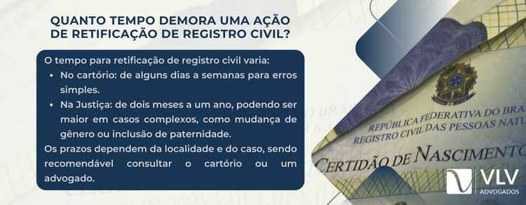 Após a entrega da documentação, o cartório fará uma análise do pedido. O processo pode levar de alguns dias a semanas, dependendo da complexidade do caso. Se a documentação estiver completa e em ordem, a retificação será aprovada.